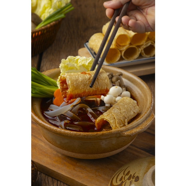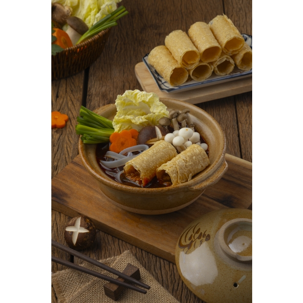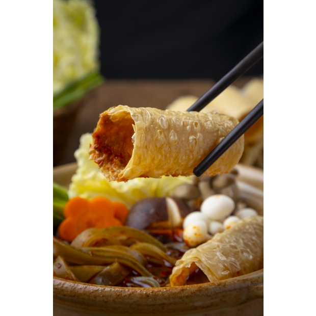火鍋、湯品涮上3分鐘,就可以吸收湯頭精華,豆皮捲耐煮且不易散開有嚼勁,讓人欲罷不能,一口接一口,火鍋必備食材!